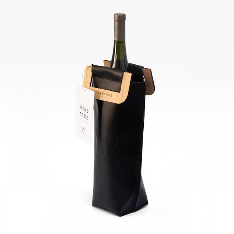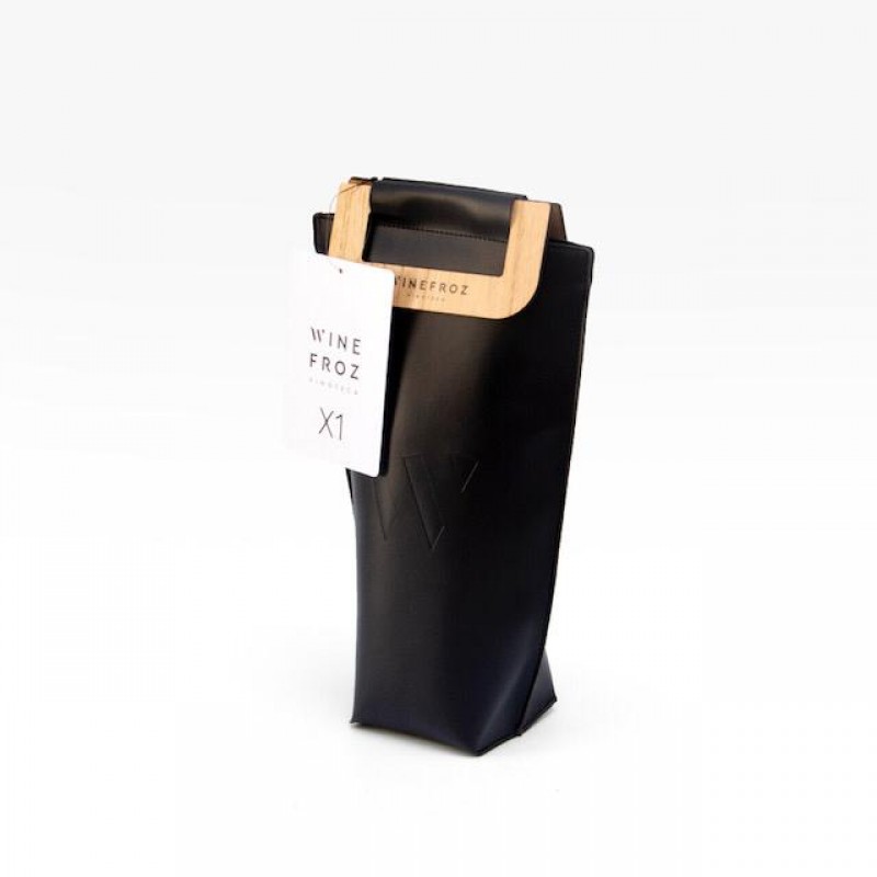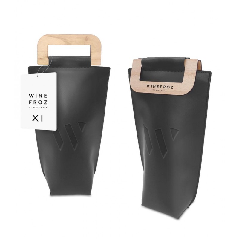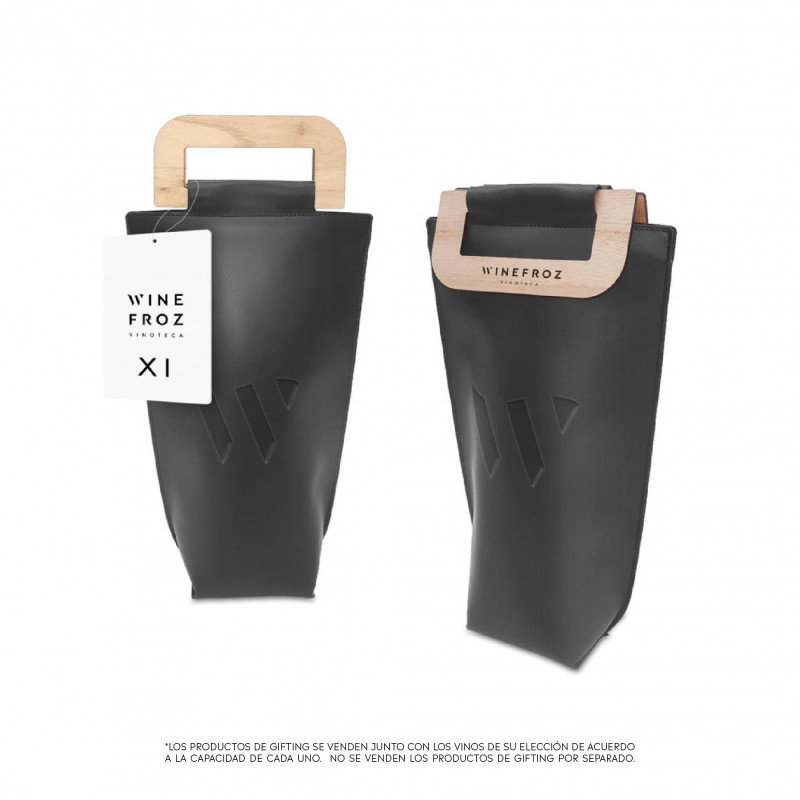 Pack ideal para llevar tu vino a una cena a la temperatura que queres que llegue.Realizado en capellada ( ecocuero) con interior térmico metalizado, manija de madera de paraíso y cierre de abrojo.